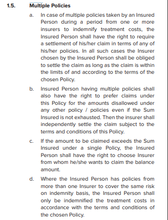 - If a single policy’s sum insured is insufficient, you can claim the balance amount from other policies you hold.