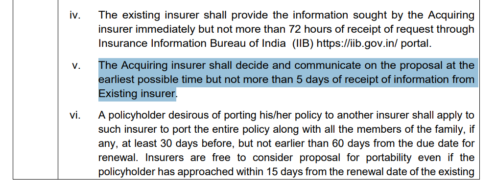 Note: Some insurers are flexible when it comes to porting, and they consider applications even two weeks before the renewal date. This is not safe as there is a risk of coverage lapse and formality delays. - Your existing insurer must share policy and claim details through the Insurance Information Bureau (IIB) portal within 7 working days of receiving the request.