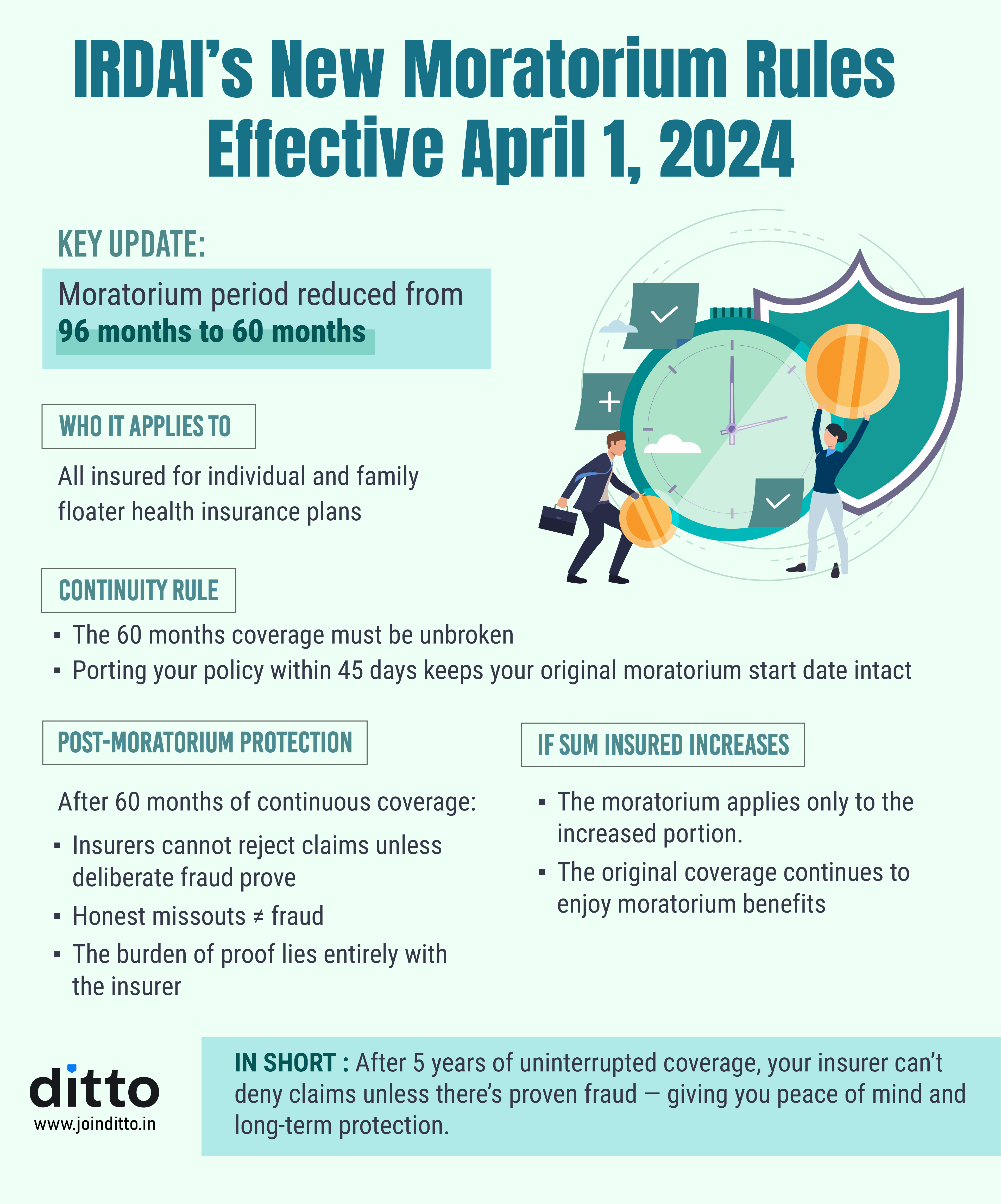 As per IRDAI guidelines effective from April 1, 2024, moratorium period in health insurance has been reduced from 8 years to 5 years. Once a policyholder completes 60 continuous months of coverage, insurers must honor claims even for undisclosed pre-existing conditions, unless they can prove fraud.