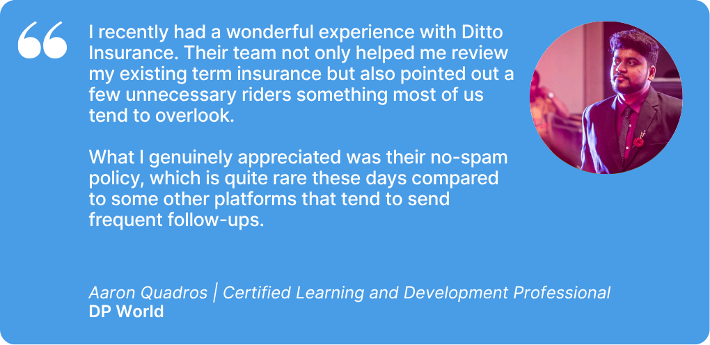 At Ditto, we’ve assisted over 8,00,000 customers with choosing the right insurance policy. Why customers like Aaron love us: